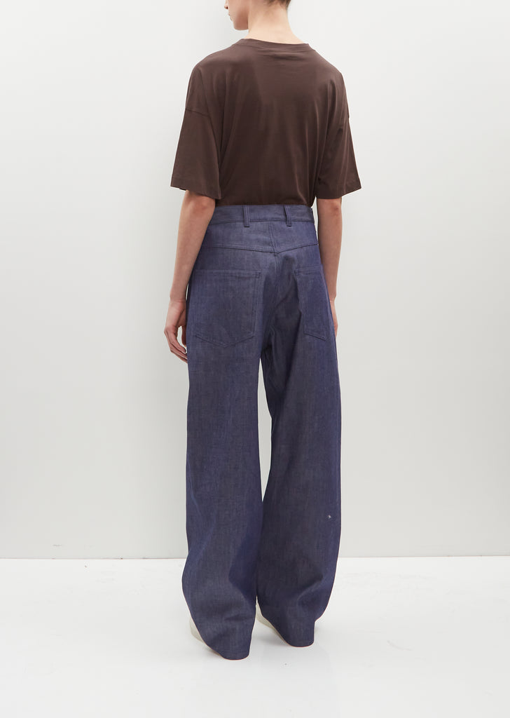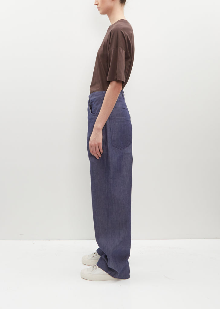 Sofie D'hoore 4-pocket denim jeans with mid-rise fit and wide legs in raw indigo denim. Features stitched rounded pockets at front and oversized patch pockets at back. Exposure button and zip fly fastening. Detailed with belt loops and silver-tone hardware.