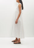 Sara Lanzi sleeveless dress with a raised waist and gathered skirt in white window pane check cotton. Concealed side seam pockets and self tie at waist for adjustable fit. Easy, popover fit.