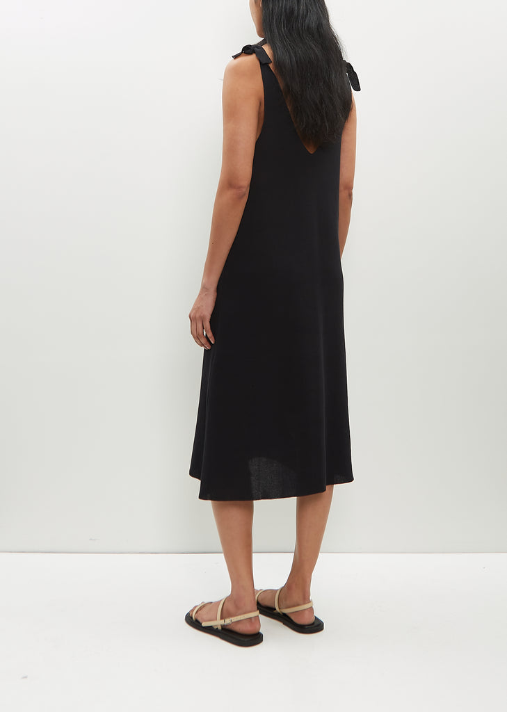 Sara Lanzi black sleeveless dress with adjustable self ties at shoulder in cotton and nylon blend knit. Features a V-neck at front and back and clean edge finish throughout. Easy popover fit.