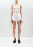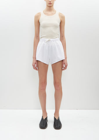 Sono signature angled shorts with an elasticated waist in optic white organic cotton. Features an elasticated waist with a natural-tone drawcord.  pockets.