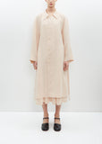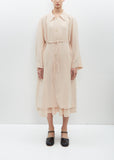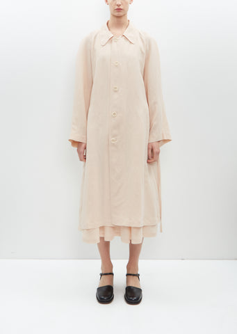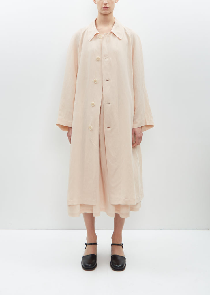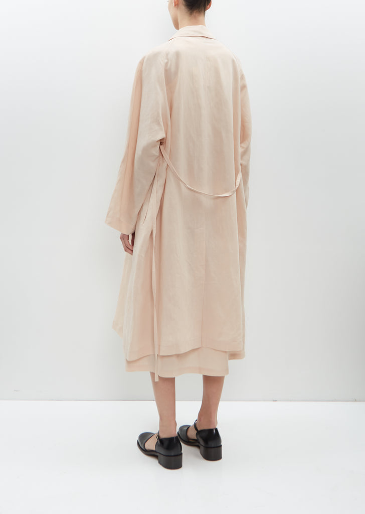 Sono single-breasted light duster coat with a thin self belt in fluid linen and Tencel blend. Features a rounded collar, wide raglan sleeves, and concealed side seam pockets. High back vent detail. Tonal front button fastening. Comes unlined.