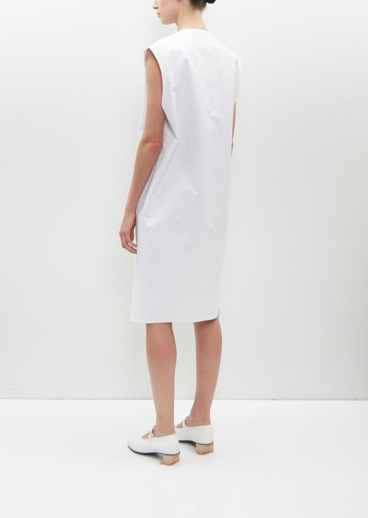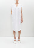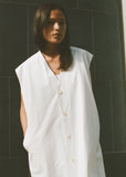 Sono white sleeveless waistcoat dress with a V-neckline and side seam pockets in washed organic cotton poplin. Finished with a Corozo buttons closure at front.
