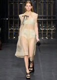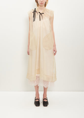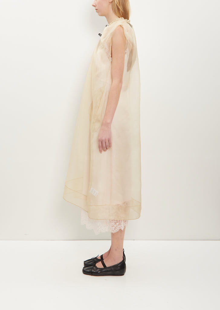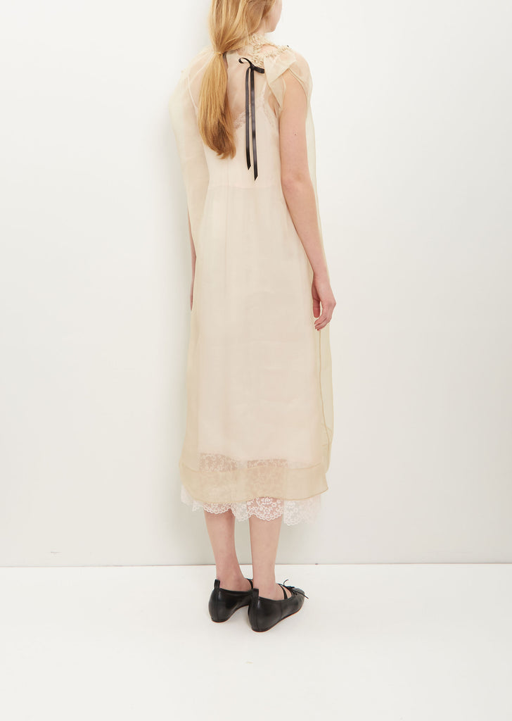 From the Runway — Simone Rocha light beige silk organdy dress featuring ruching detail at small V-neckline and at shoulder splits. Accented with contrast black ribbon ties at front and back. Soft A-line silhouette with a loose fit. Shown with Slip Dress W/ Deep Lace Trim in Pale Rose.