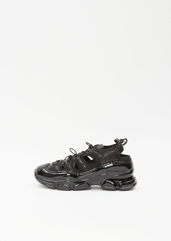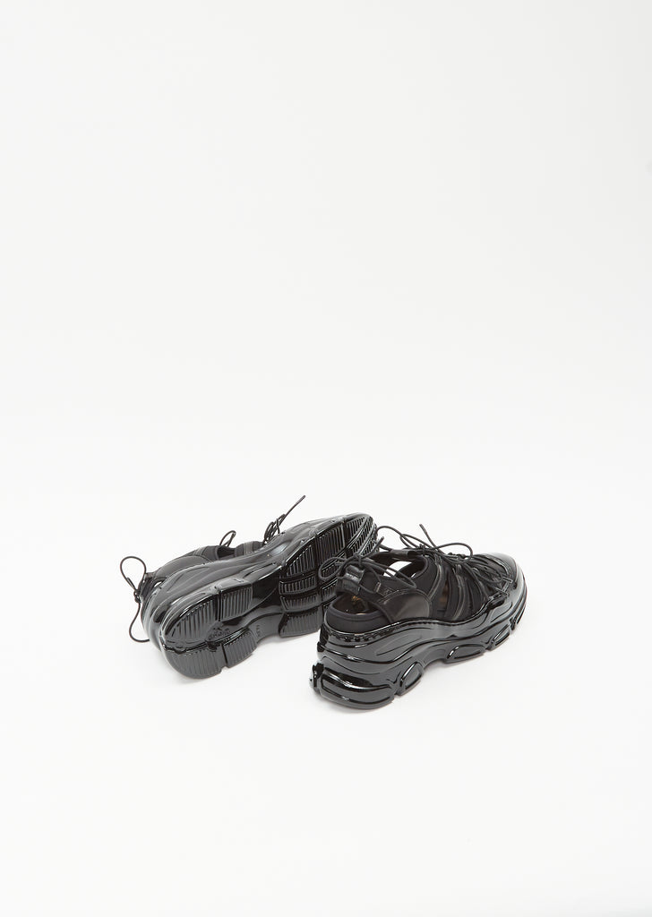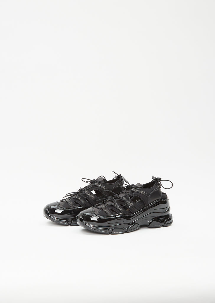 Simone Rocha black trainers with cut out details and bows in tech fabric and nappa leather. Lined in leather with a vinyl sole.