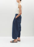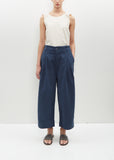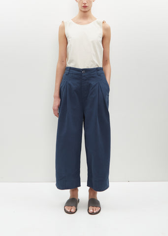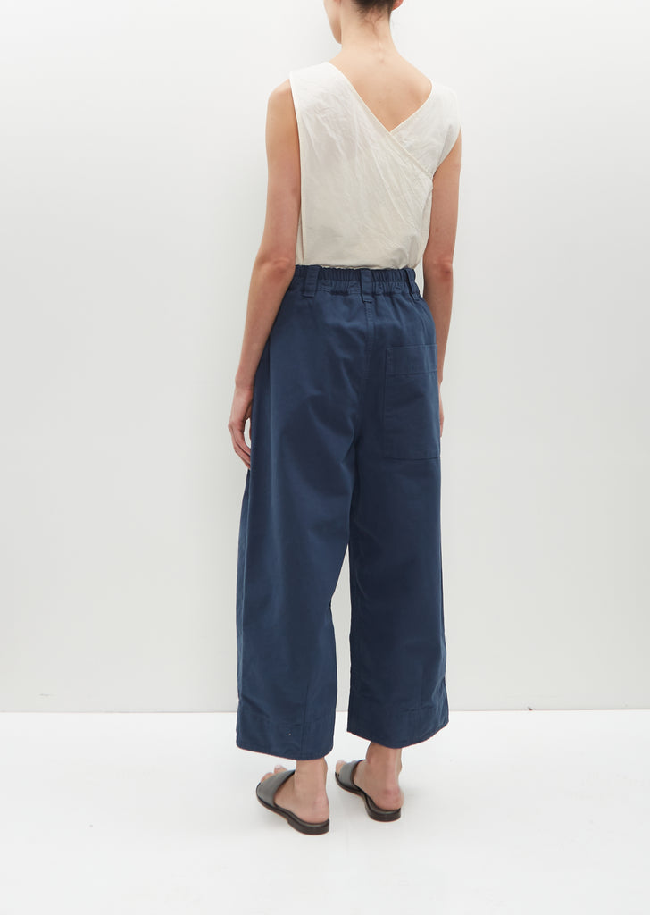 Toogood cropped trouser with wide tapered legs and front pleats in mid-weight cotton canvas. Features a half-elastic waistband, wide belt loops, side seam pockets, a single deep patch pocket at back, darts at bottom hems and a concealed button closure at front.