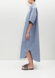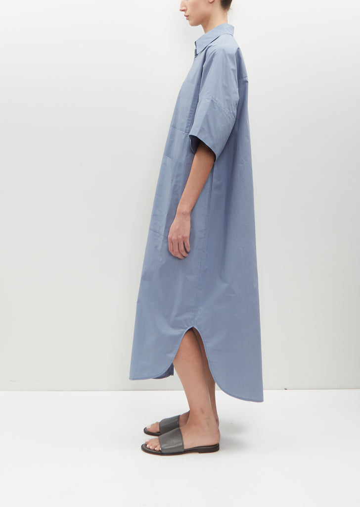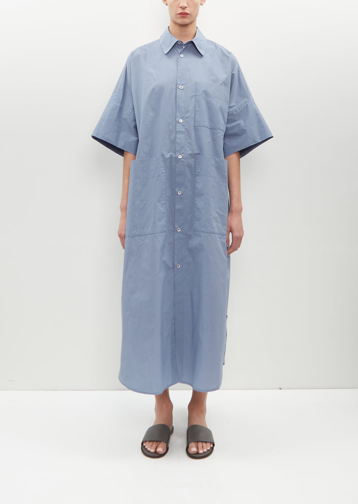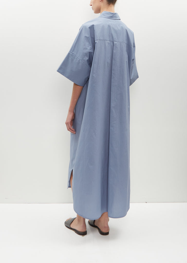Toogood dusty blue short sleeve shirt dress with drop shoulders and deep turn-back cuffs in lightweight textured crisp cotton. Features a shirt collar, a back yoke with a large pleat, deep patch pockets and hammered metal buttons closure at front.