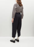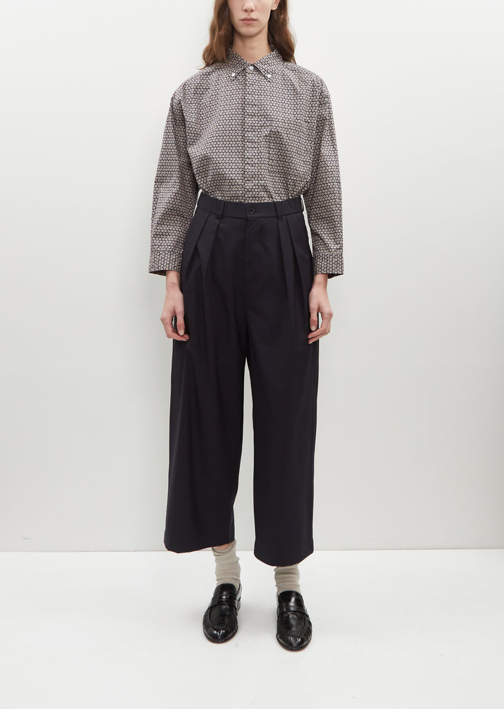 Toujours signature pleated trousers with cropped, wide legs in navy fluid tropical wool. Features a self waistband, slash side pockets and back welt pockets. Detailed with belt loops. Button and zip fly fastening.