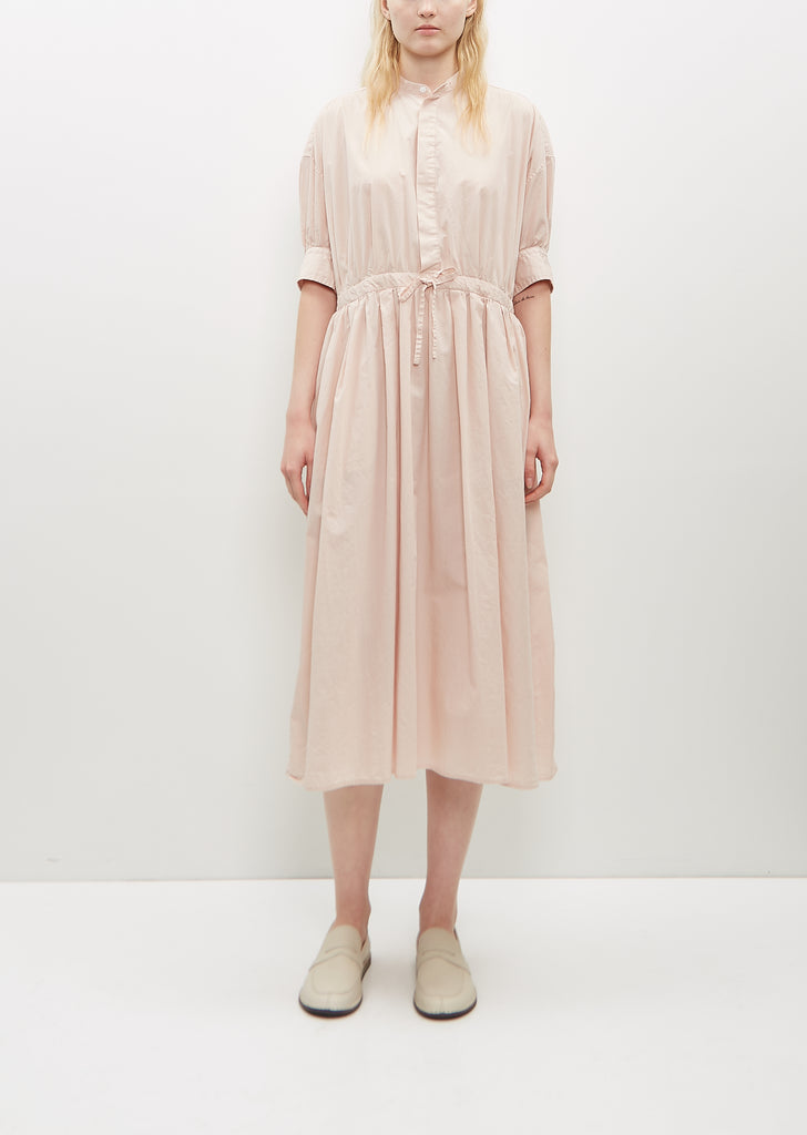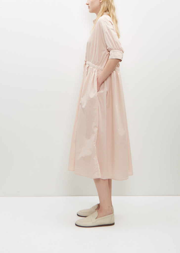 Toujours pale pink shirt dress with a pleated skirt and half bishop cuffed sleeves in cotton shirting. Features a band collar, hidden buttoned half placket and self ties at waist. Concealed side seam pockets.