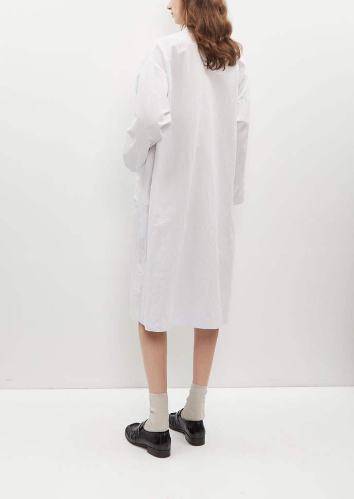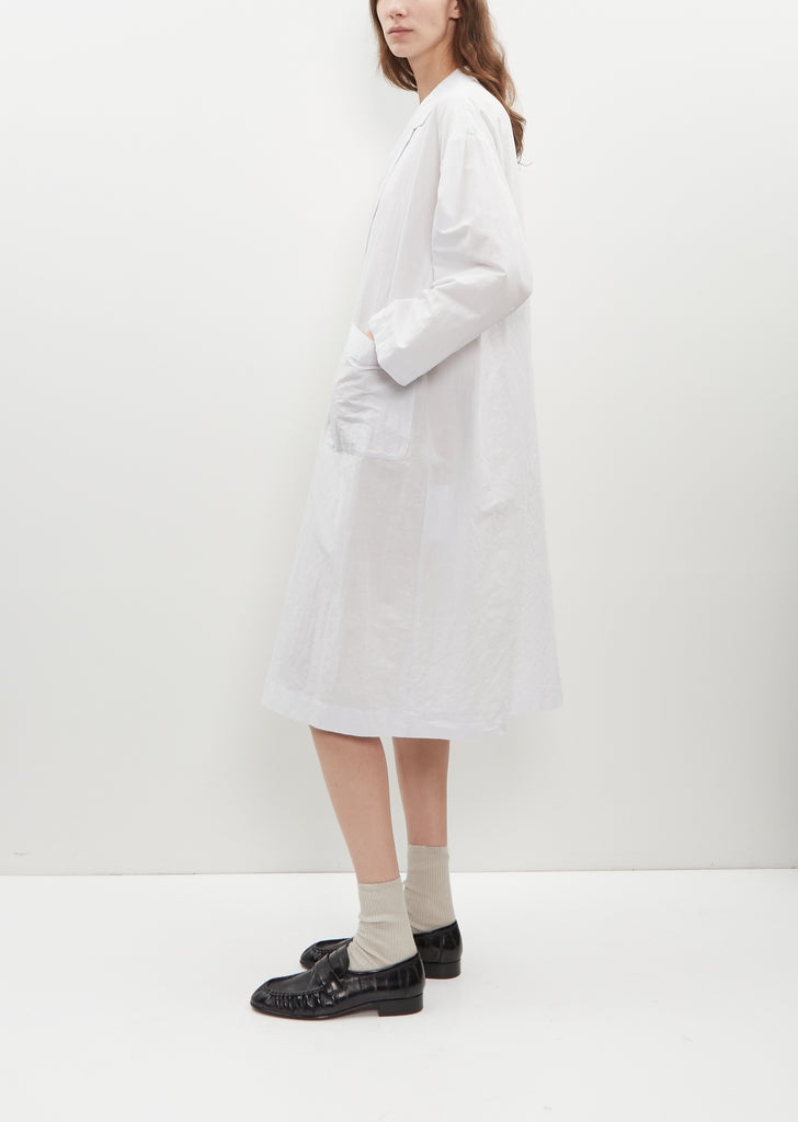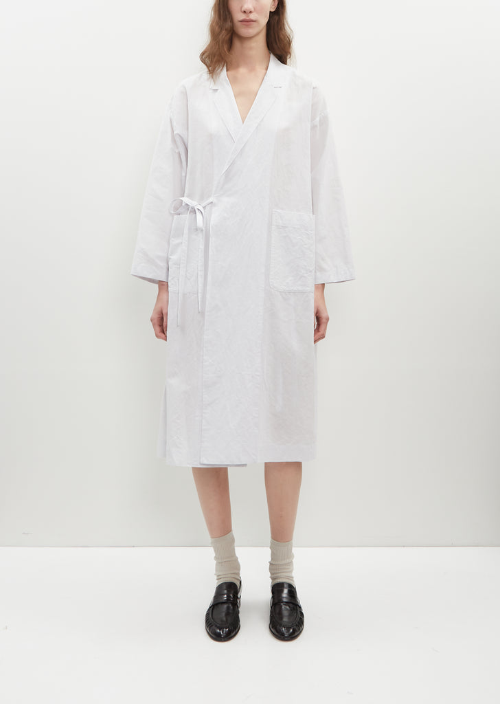 Toujours wrap dress with notch lapels in smoke white linen and cotton blend. Features a self tie side fastening and side patch pockets. This piece can be worn as a dress as shown or as a light jacket.