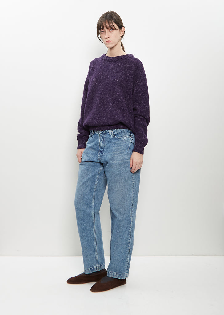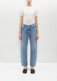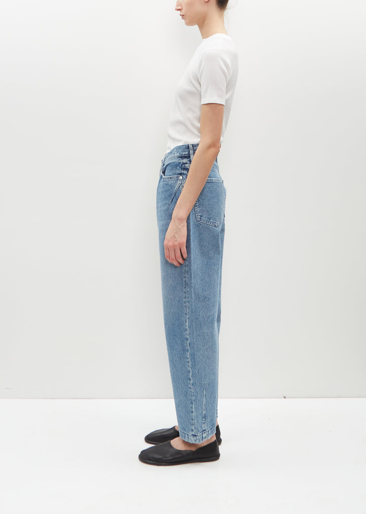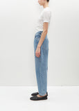 Tanaka mid blue high-rise fit jean with wide tapered legs and a 5-pocket construction in cotton denim with a washed finish. Features a slightly dipped waistline at front, belt loops and a button and zip-fly fastening.