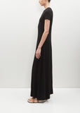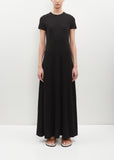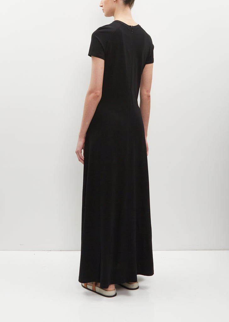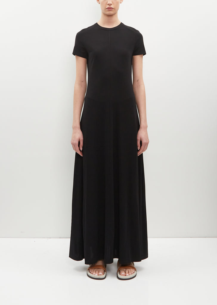 Totême black maxi dress with short raglan sleeves and flared skirt in fluid stretch viscose jersey. Features a paneled construction with center front and back seams. Back zip closure.