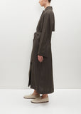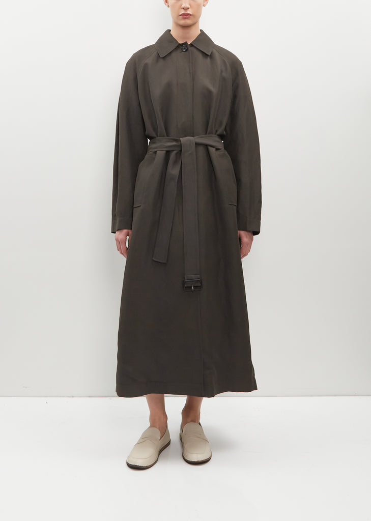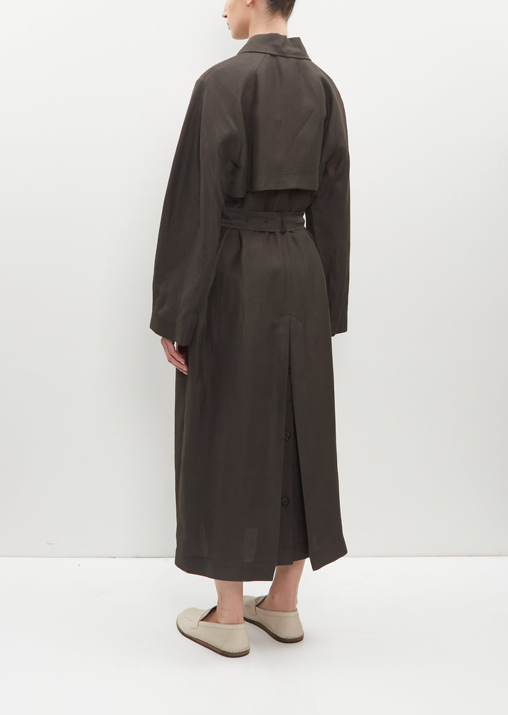 Totême anthracite trench coat with a flap yoke at back in breathable linen and viscose blend twill. Features a spread collar, raglan sleeves, belt loops, a detachable belt, side welt pockets, a slit with buttoned gusset at back and a concealed horn-hued buttons closure at front. Comes partially lined in cotton twill at front.