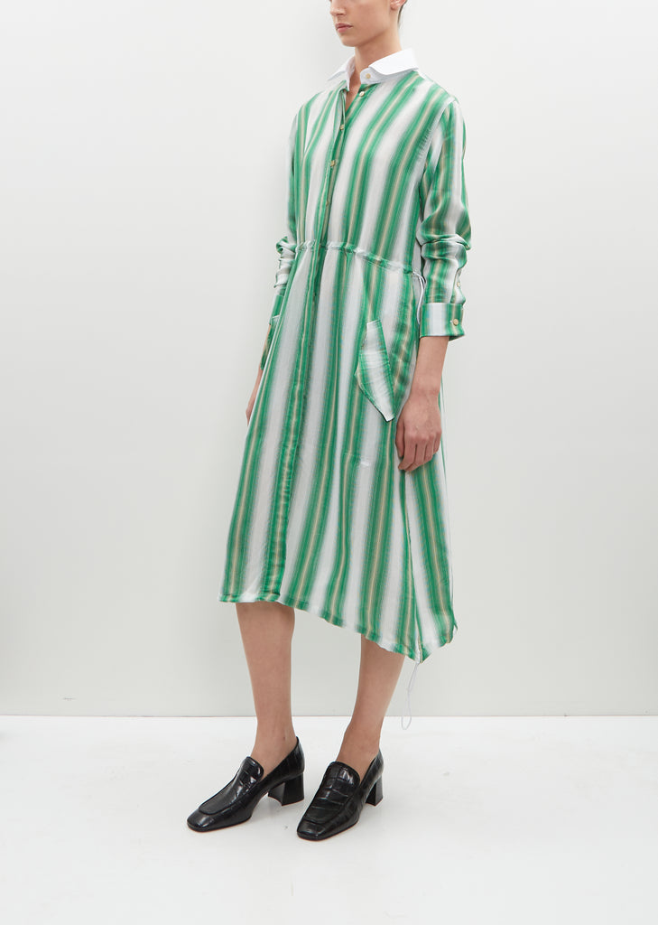 Wales Bonner green and white stripe shirt dress with a solid white collar and adjustable drawcord waist and hem in lightweight viscose and silk blend. Features cuffed sleeves, angled flap pockets and buttoned turn back sleeves. Full button front fastening on a hidden placket.