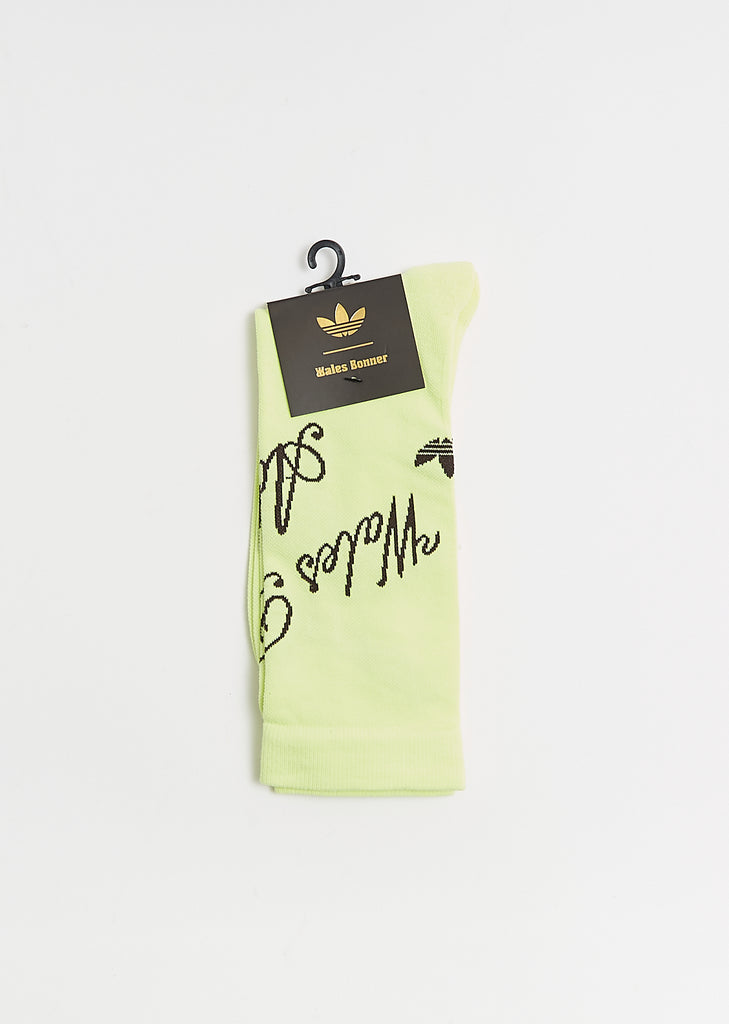 Wales Bonner x Adidas yellow crew socks with a reinforced toe and heel in ribbed recycled polyester blend knit. Detailed with contrast brown Wales Bonner and Adidas branding.