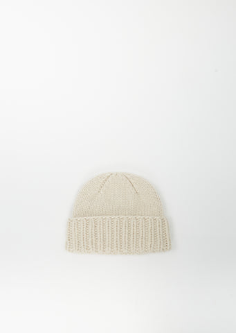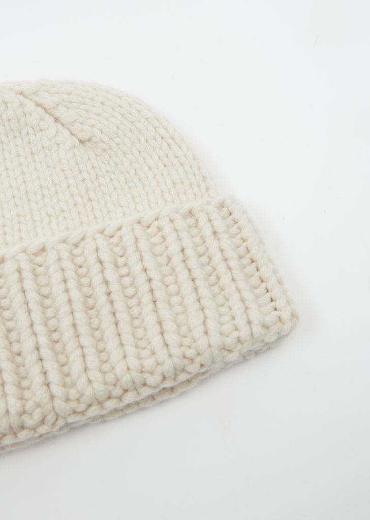 Wommelsdorff latte white turnover beanie hand-knitted from the finest heavyweight cashmere yarn in Berlin. Finished with a rib trim.