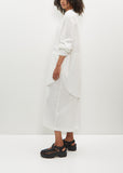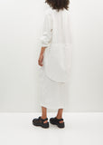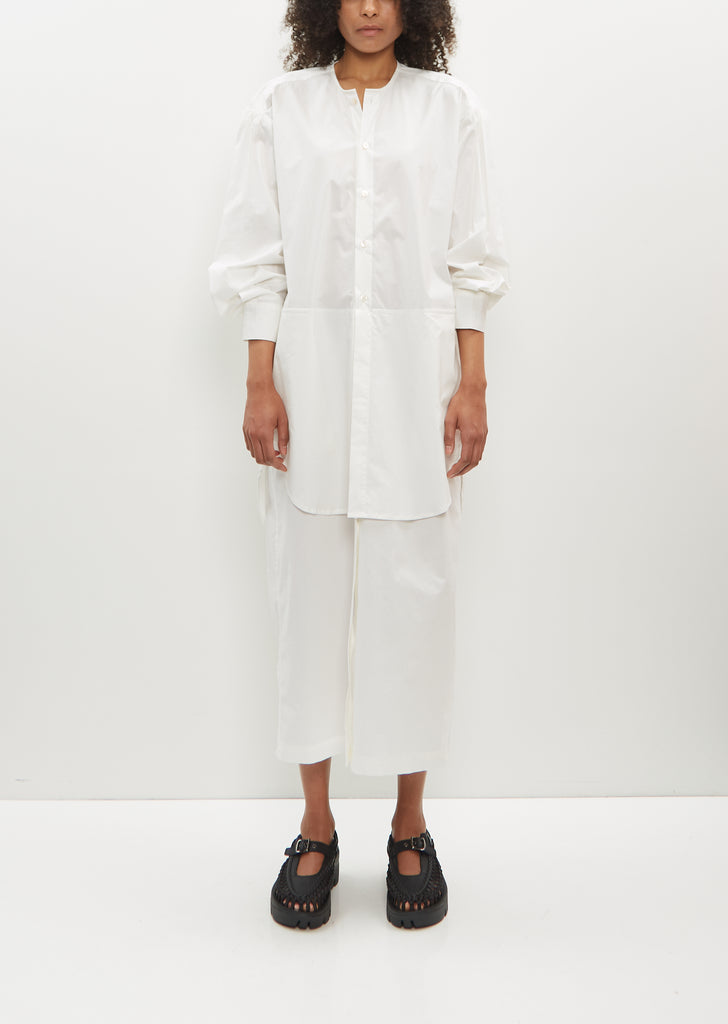 Wright + Doyle chalk white collarless shirt dress with a shirttail hem in a cotton blend. Features a half buttoned sleeve that can be undone to tie at front. Slightly dropped shoulders, and cuffed pleated sleeves. Oversized fit.