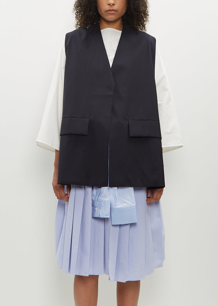 Wright + Doyle ink navy vest blazer with open sides in tropical wool. Features front flap pockets and self belt at sides. Comes fully lined.