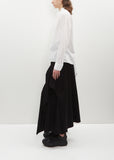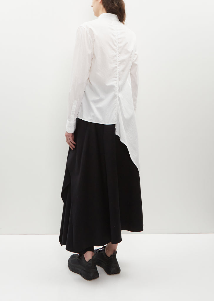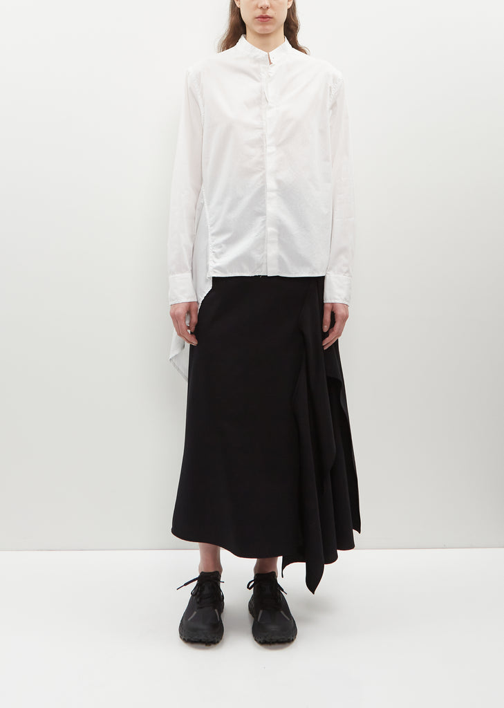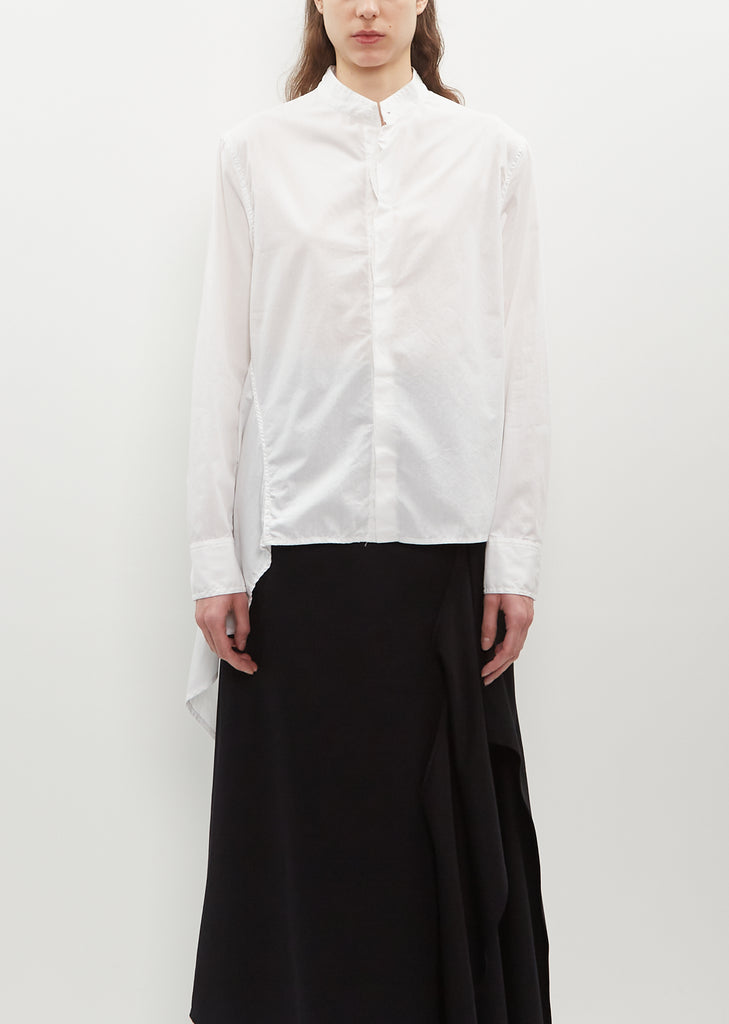 Yohji Yamamoto white band collar blouse with asymmetric side-to-back handkerchief flare in cotton shirting. Features a hidden front button placket, and pleated shirt cuffs. Regular fit.