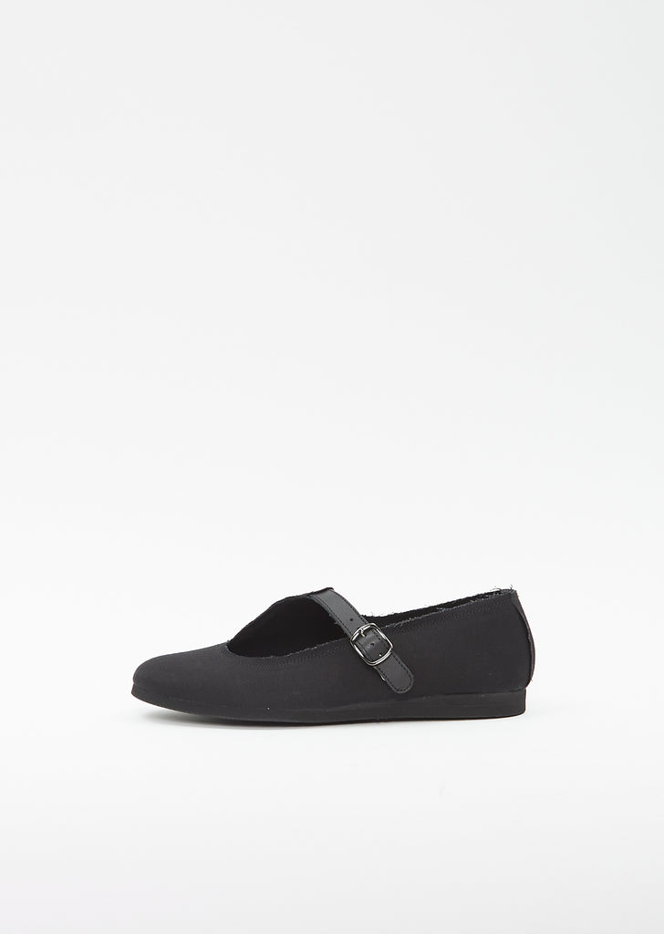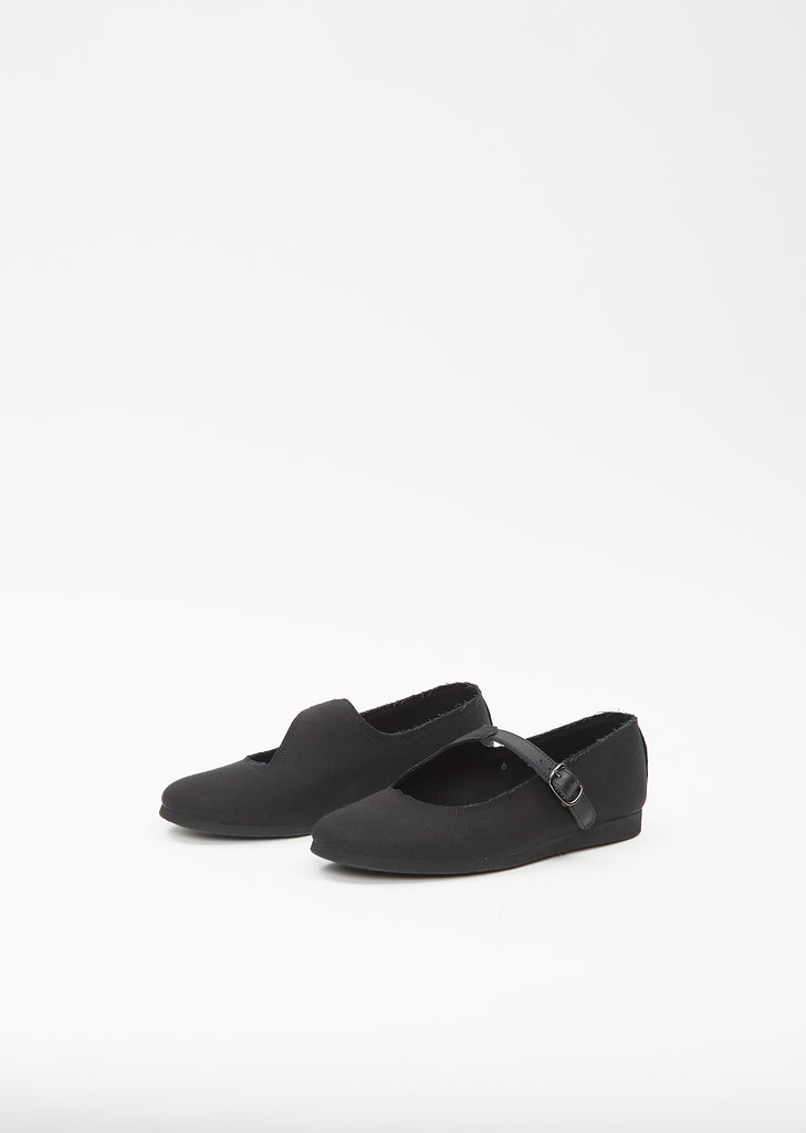Yohji Yamamoto black asymmetrical mary jane with an adjustable leather strap and press button fastening in cotton oxford fabric. Features a round toe, a silver-tone buckle, raw edges at top line and a rubber sole.