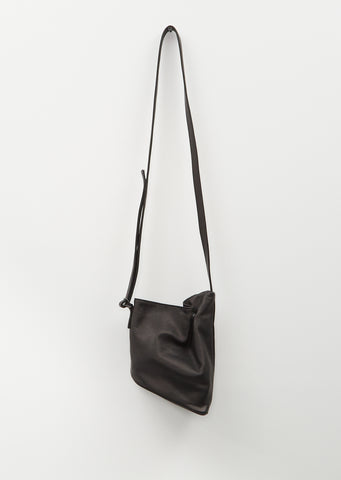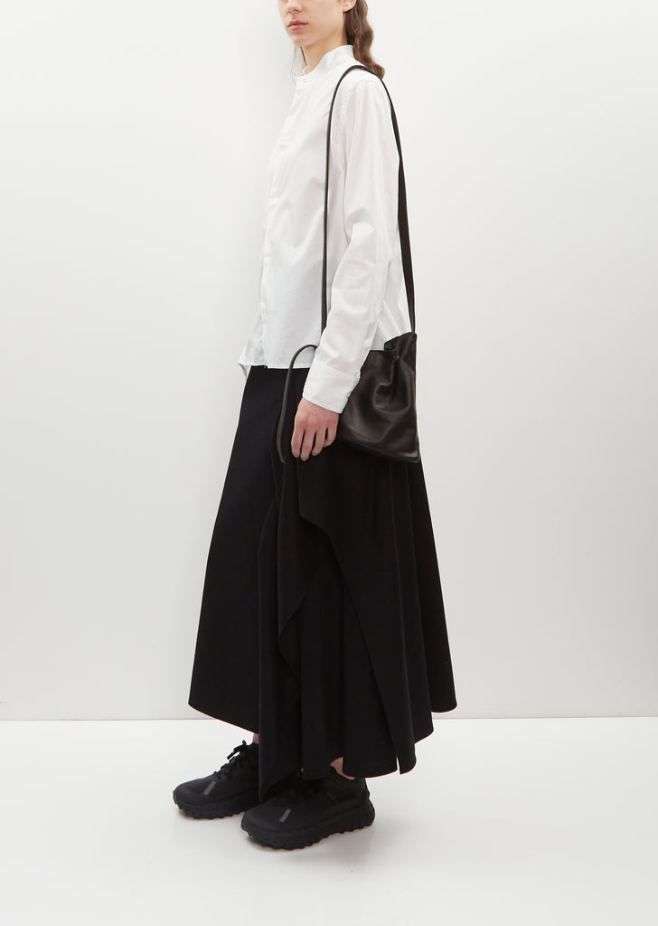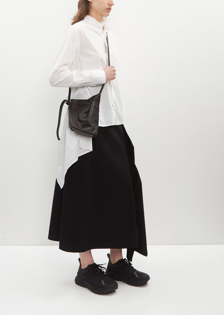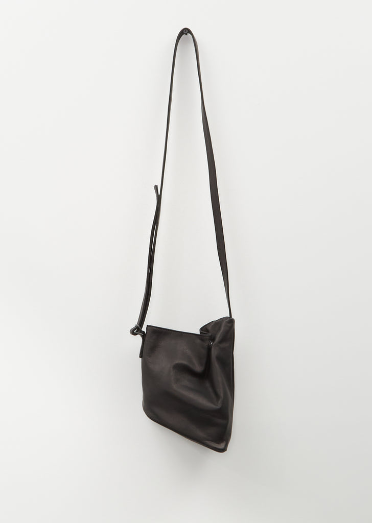 Yohji Yamamoto shoulder asymmetrical pouch bag in soft leather. Features an adjustable shoulder strap and snap buttons closure. Finished with black-tone metal hardware.
