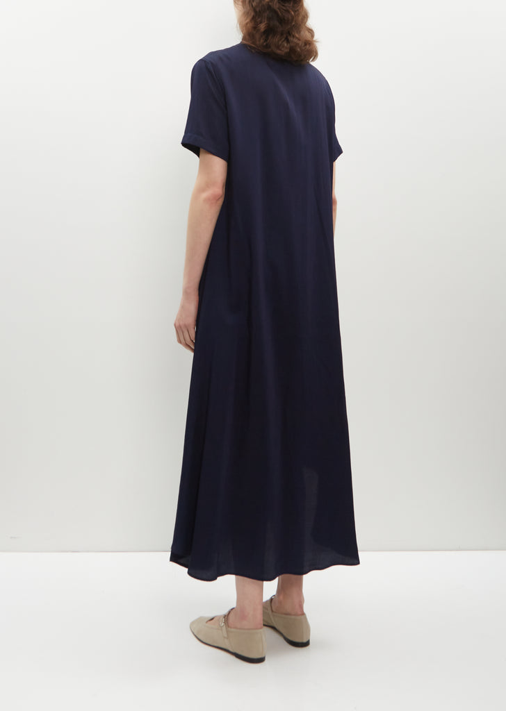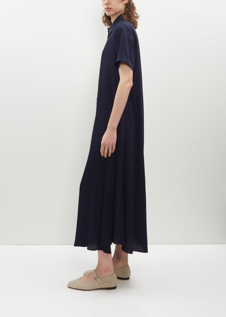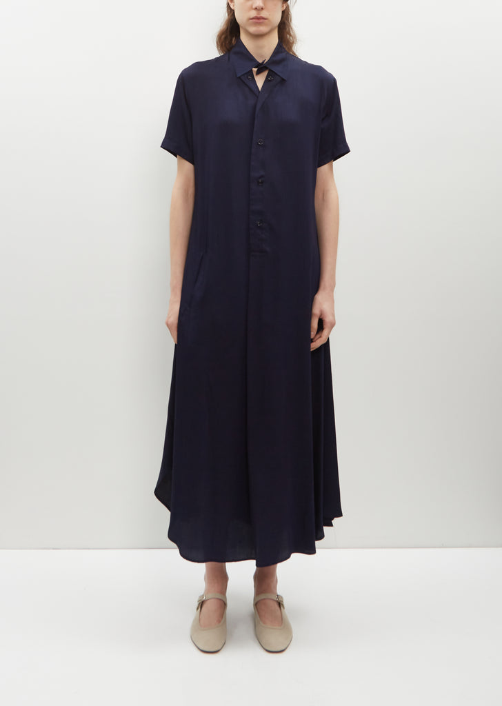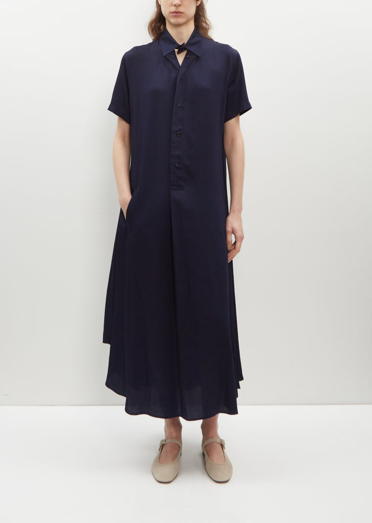 Y's by Yohji Yamamoto indigo blue shirt dress with buttoned collar in fluid cupro. Features set-in short sleeves and angled welt front-side pockets. Subtle flare silhouette skirt.