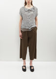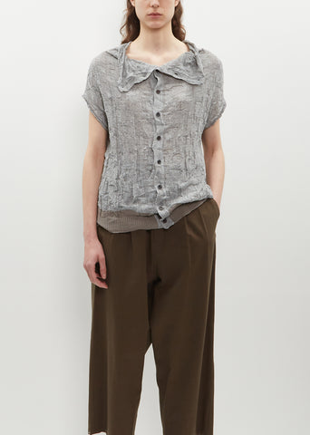 Y's by Yohji Yamamoto grey cardigan with and loose buttoned neckline in uneven grid pattern stitch in crinkled polyester and flax blend knit. Features a convertible neckline that can be loosely buttoned up, or down (as shown). Finished with a rolled edge throughout.