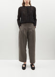Y's by Yohji Yamamoto black cropped cardigan with uneven grid pattern stitch in crinkled polyester and flax blend knit. Features a small boatneck, and rolled edge finish throughout.