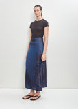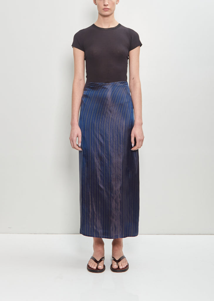 6397 iridescent blue stripe straight skirt with a draped wrap front in smooth acetate and viscose blend. Features hook and eye zip closure at back waist.