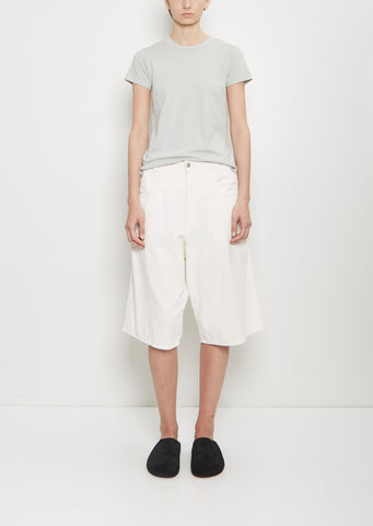 6397 ivory baggy short with wide legs in soft cotton corduroy. Features 5-pocket construction and a silver-tone tack button and zip-fly fastening.