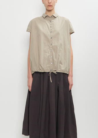 Album di Famiglia stone grey short sleeve shirt with a tonal adjustable drawstring at bottom hem for added volume in lightweight tissue cotton. Features a mini spread collar and nacre-hued buttons closure at front. Relaxed fit.