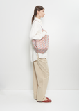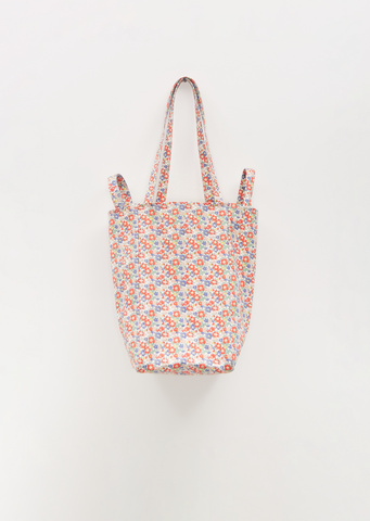 La Garçonne x Amiacalva Exclusive — signature medium tote bag in red Liberty flower printed mid-weight cotton canvas. Features two shoulder straps, two top handles, two tonal deep interior slip pockets, interior tie closure and interior leather branded embossed tag.