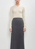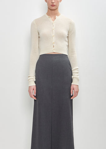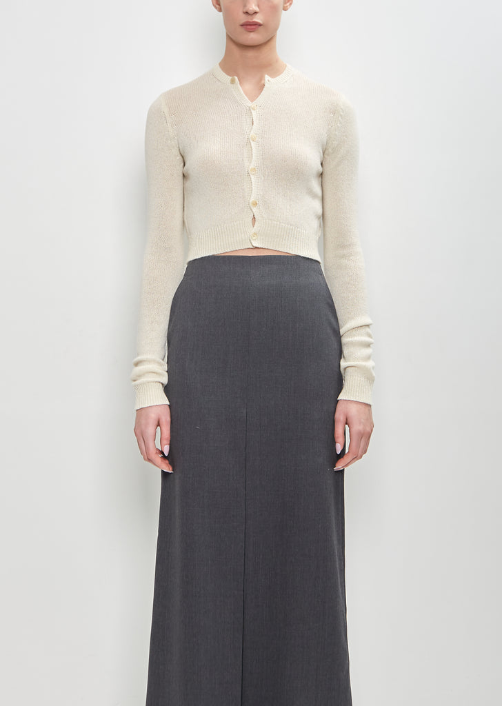 Auralee ivory white crewneck cardigan with tonal button front closure in cashmere knit. Features ribbed trim finish at neckline, cuffs, and hem. Closer fit.