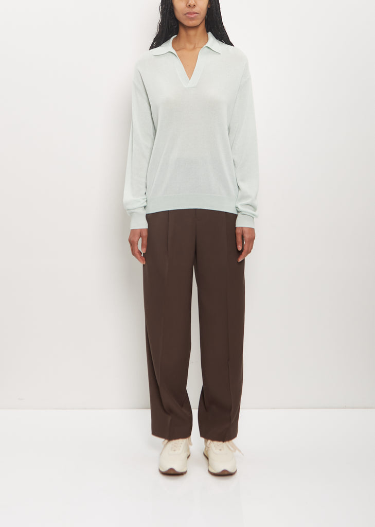 Auralee light green polo with V-neckline and open spread collar in washable lightweight cashmere and silk knit. Features slightly dropped shoulders and ribbed trim finish at collar, cuffs, and hem. Relaxed fit.