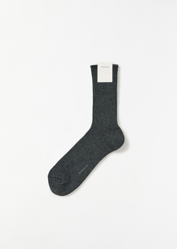 Auralee signature top charcoal ribbed, low gauge trouser socks made of a blend of ultra-long cotton and cashmere yarn.