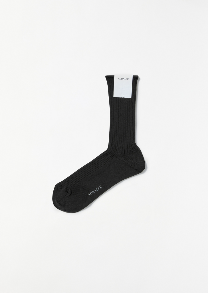 Auralee black trouser socks in a ribbed high gauge stretch cotton blend knit.