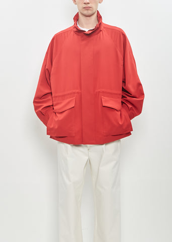 Auralee red oversized blouson with high drawcord neck and drawcord waist in wool canvas. Features raglan sleeves with vent, front flap patch pockets with press buttons, press button cuffs, and zipper closure with two press buttons at neck.