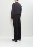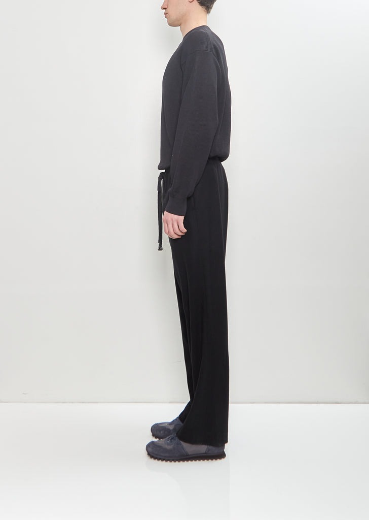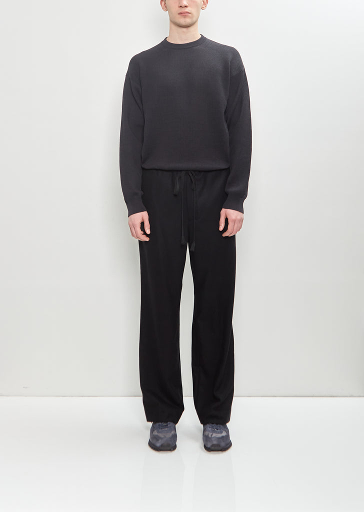 Auralee black drawstring pants with straight legs and concealed zipper placket in smooth cashmere. Features sides seam pockets and single patch pocket at back. Relaxed fit.