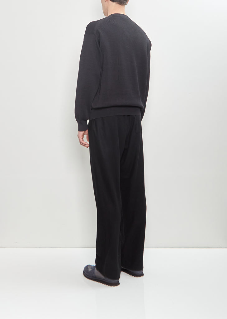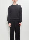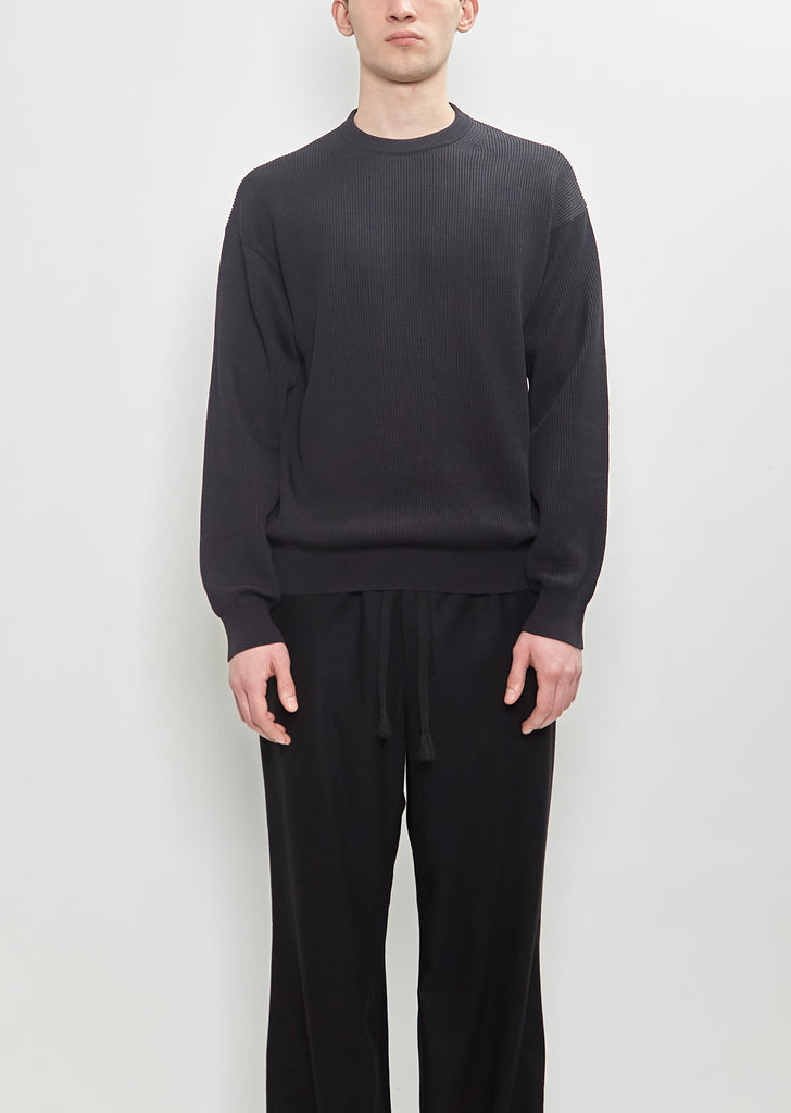 Auralee black pullover with crew neckline in ribbed cotton knit. Features contrasting ribbed knit finish at neckline, cuffs, and hem. Relaxed fit.