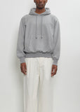 Auralee top grey pullover with a drawstring hood and kangaroo pocket in a rugged cotton. Features dropped shoulders and ribbed trim finish at side panels, cuffs, and hem. Lined in off-white soft terry cloth fabric. Relaxed fit.