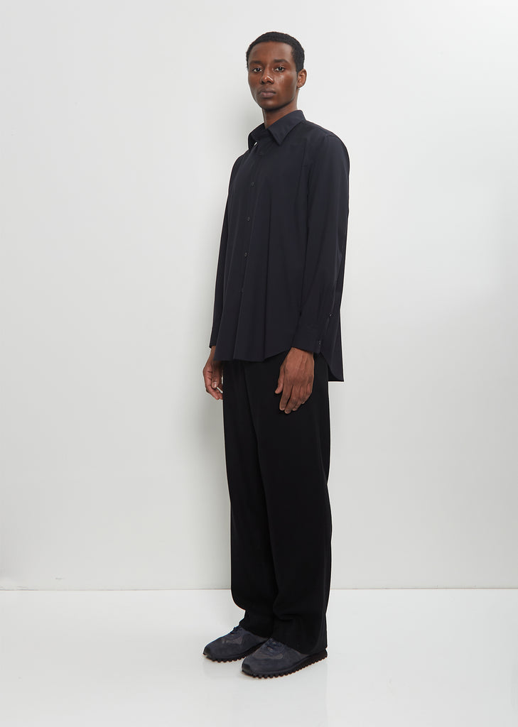 Auralee dark navy button down shirt in a fine tropical wool. Features a classic point collar, buttoned cuffs, curved hem, two box pleats at back yoke, and a tonal button front closure.