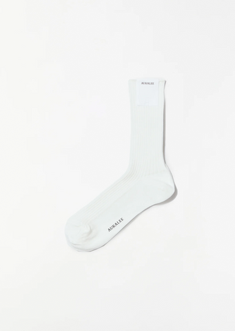 Auralee white trouser socks in a ribbed high gauge stretch cotton blend knit.