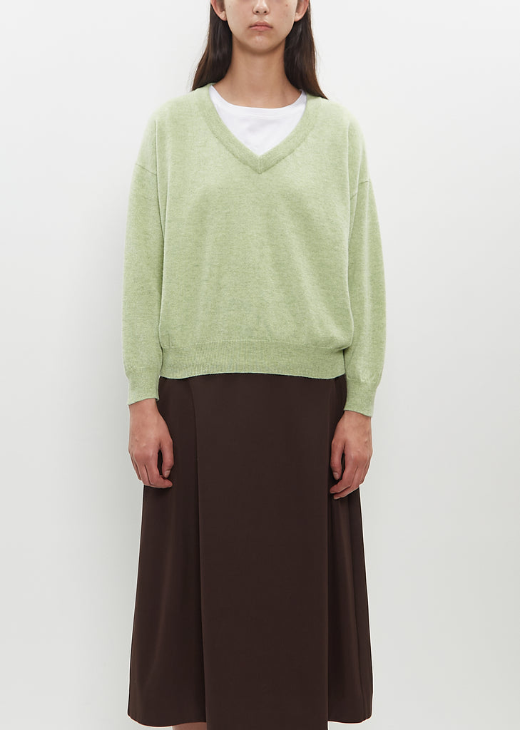 Begg x Co light green V-neck sweater knitted in 1-ply cashmere. Features dropped shoulders and ribbed trim at neckline, cuffs, and hem. Relaxed fit.