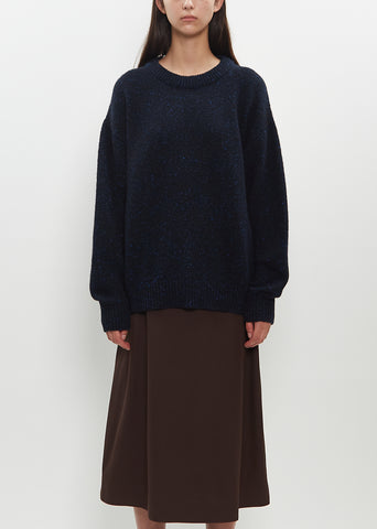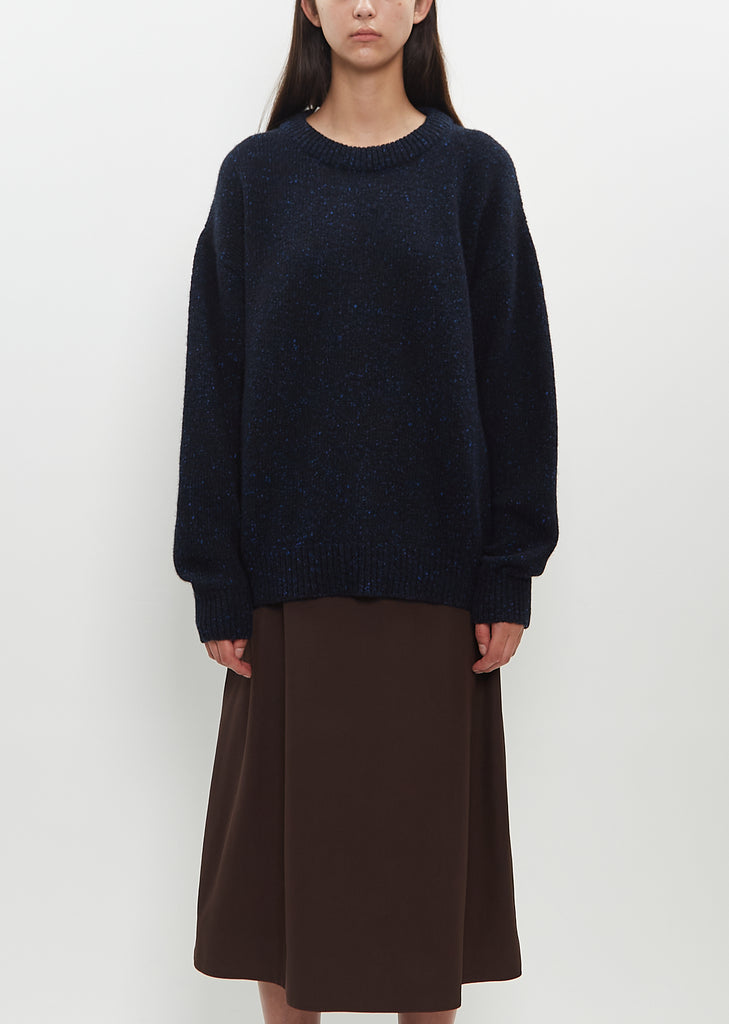Begg x Co blue and black sweater with a round neck knitted in chunky 1-ply cashmere. Features dropped shoulders and ribbed trim at neckline, cuffs, and hem. Relaxed fit.