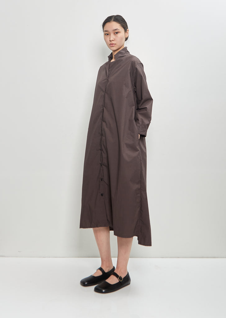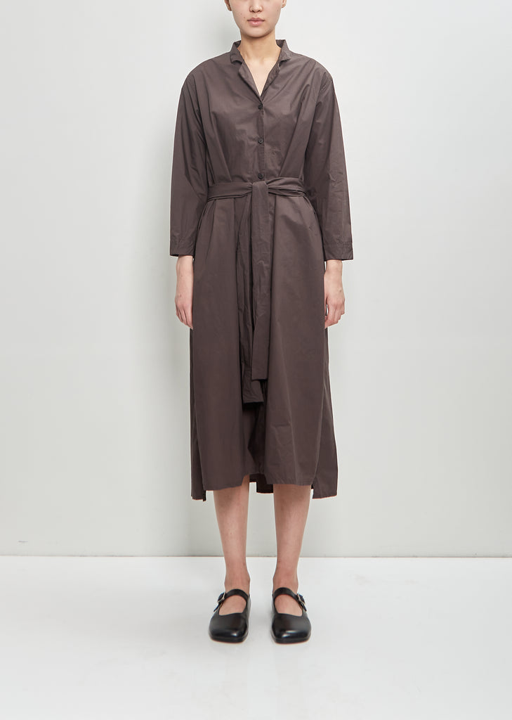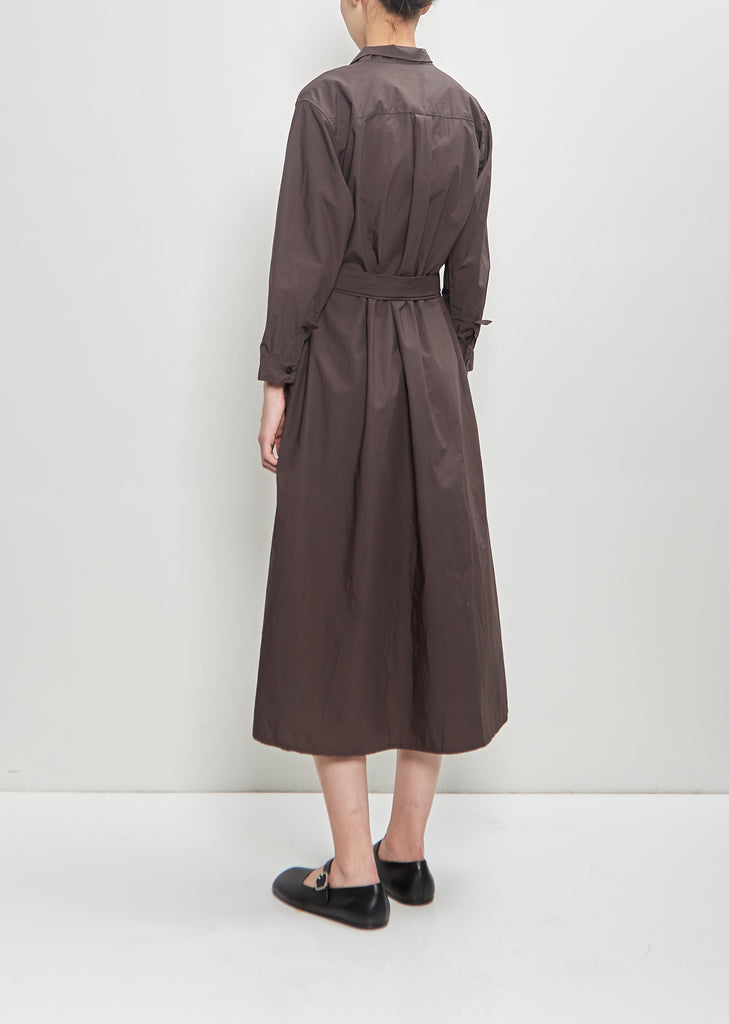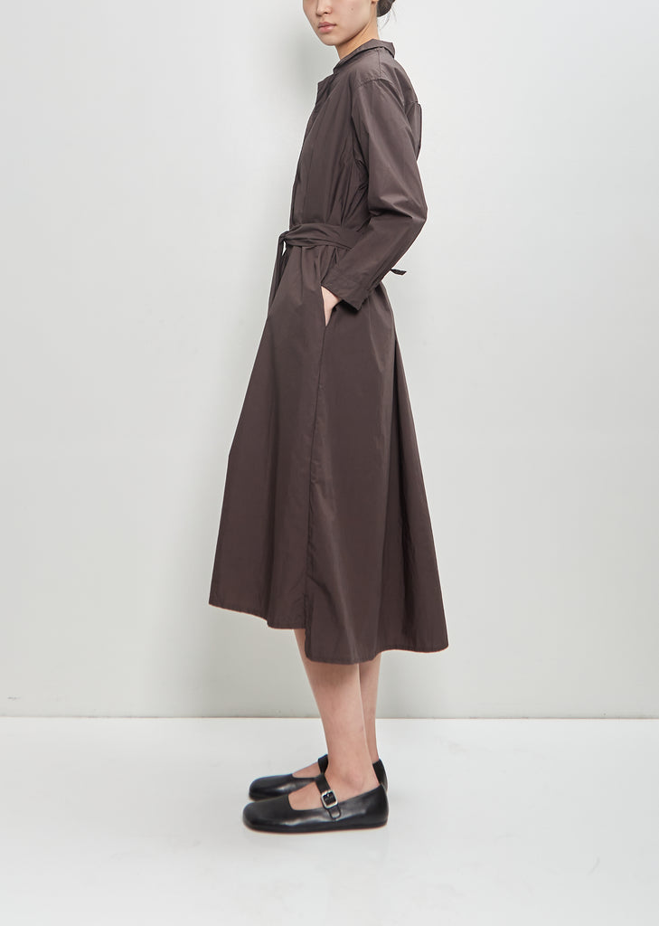 Bergfabel coffee brown shirt dress with V-neckline and notched collar in cotton linen blend. Features buttoned cuffs, side seam pockets, single box pleat at back yoke, optional self belt and buttons closure at front. Finished with white shell buttons throughout.