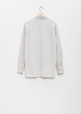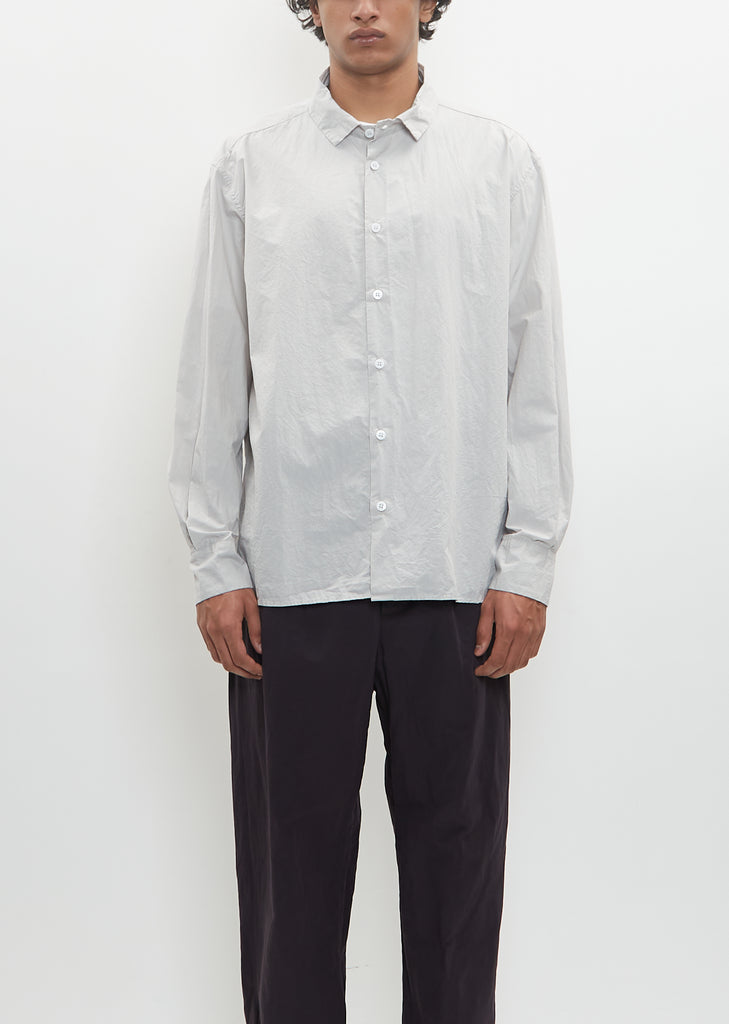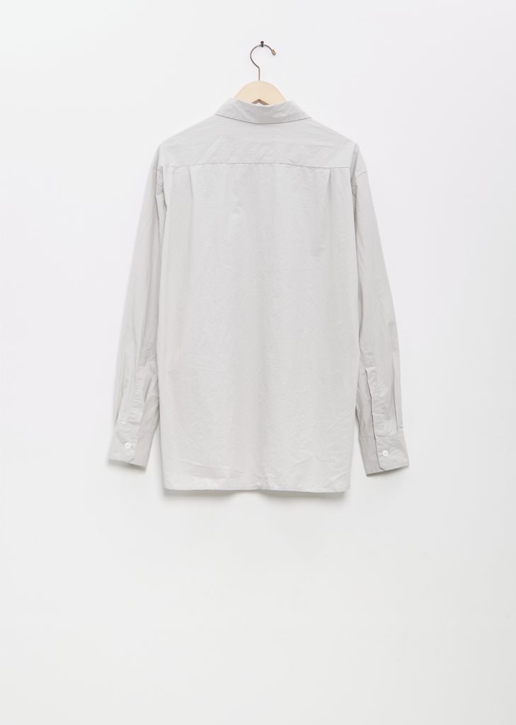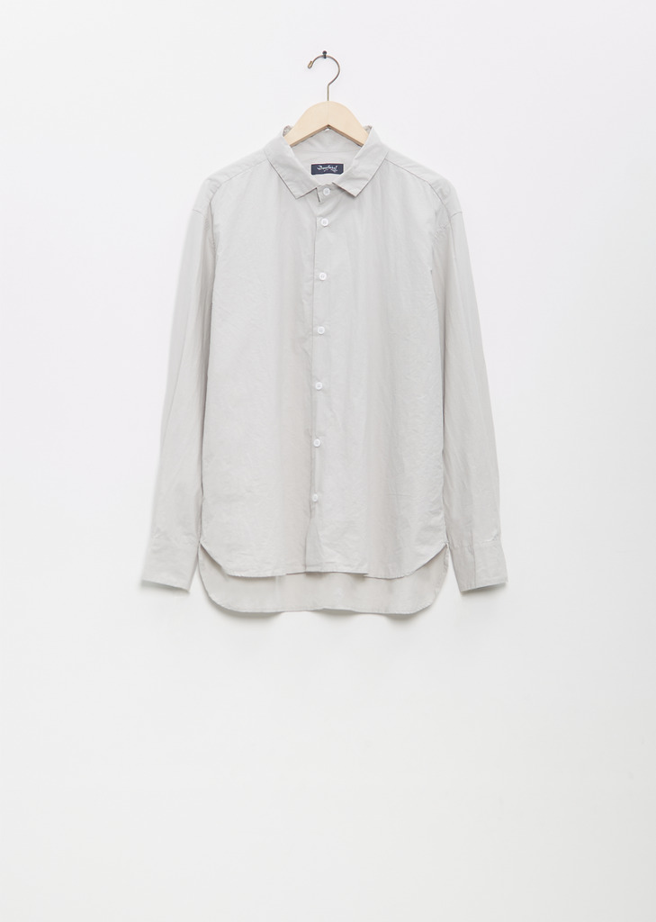Bergfabel grey shirt with classic shirt collar and shell-hued button front in cotton. Features side pleats at back yoke, pleated buttoned cuffs, and a slightly longer back hem.