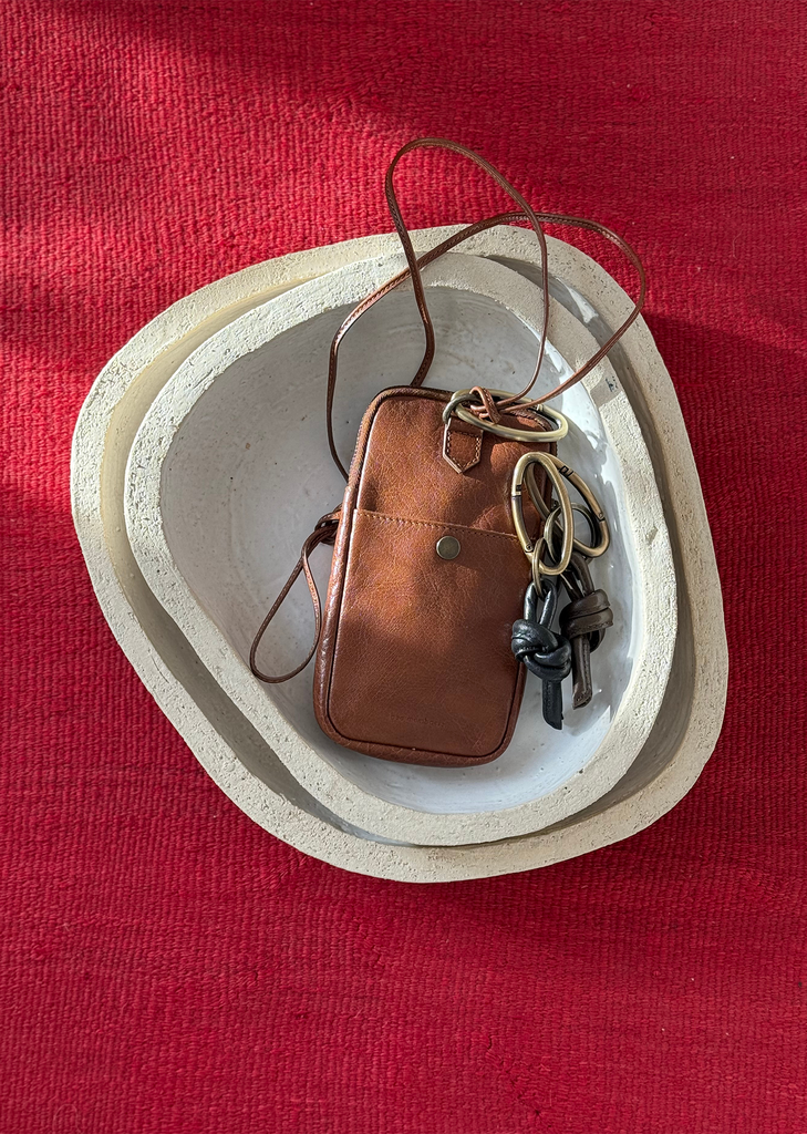 Bea Mombaers cognac brown phone bag with a top zipper closure and a detachable clasp key ring. Features a long neck strap, an interior slip pocket and a press buttoned slip pocket at back. Comes lined in cotton canvas.