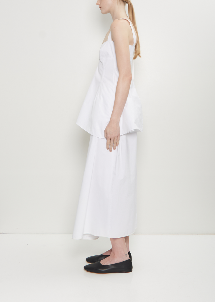 Carven white long camisole top with a deep neckline, fitted cups, and loose flared waist in heavyweight and crisp poplin. Features stitch finished straps, side seam pockets, and back zipper closure with long fabric toggle. Fully lined in tonal cotton fabric.