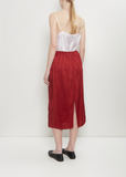 Carven ruby red straight pull-on skirt with an elasticated waist in smooth and luxurious silk. Features a high slit at back hem, and a button and loop fastening at back waist.