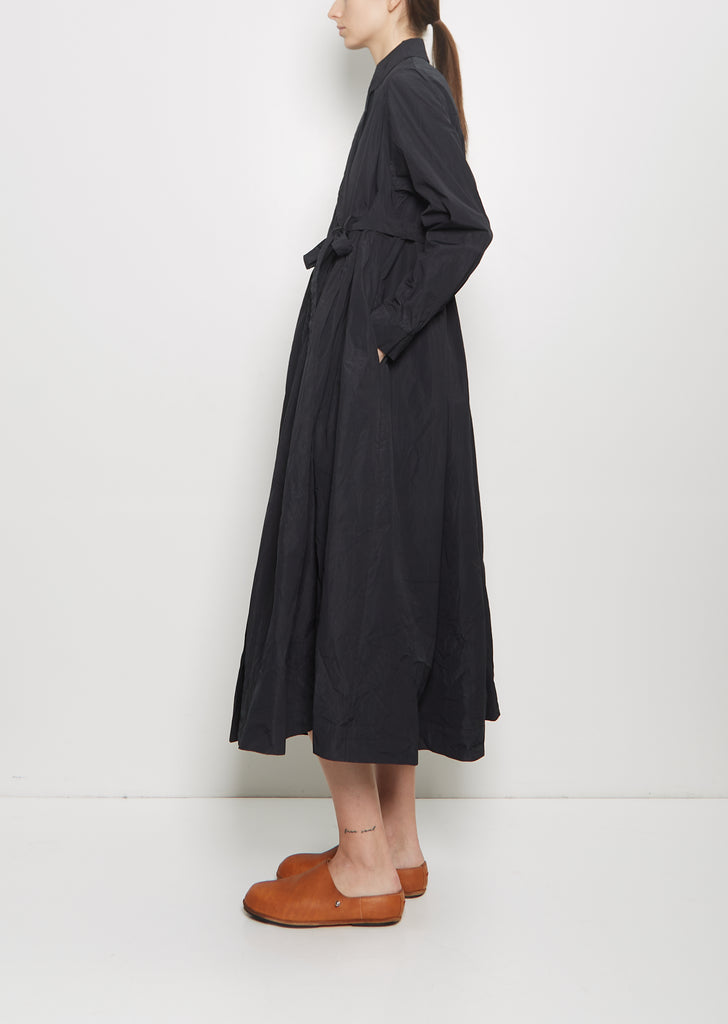 Casey Casey black wrap dress with a notched collar and self belt fastening in a crisp cotton taffeta with a washed finish. Features belt loops, a gathered waist, side seam pockets, buttoned cuffs, gathered back yoke, and an interior single button fastening. Can also be worn as a coat.