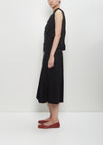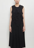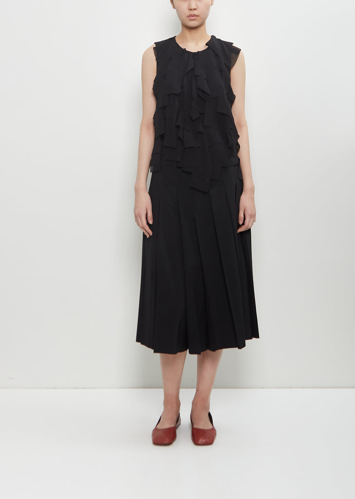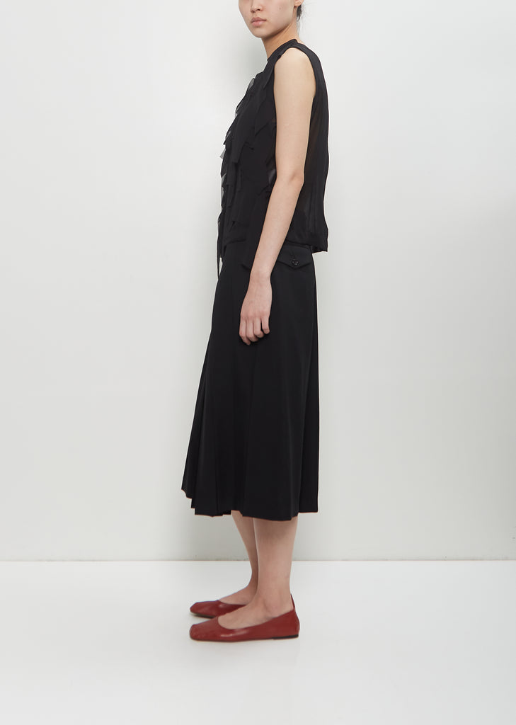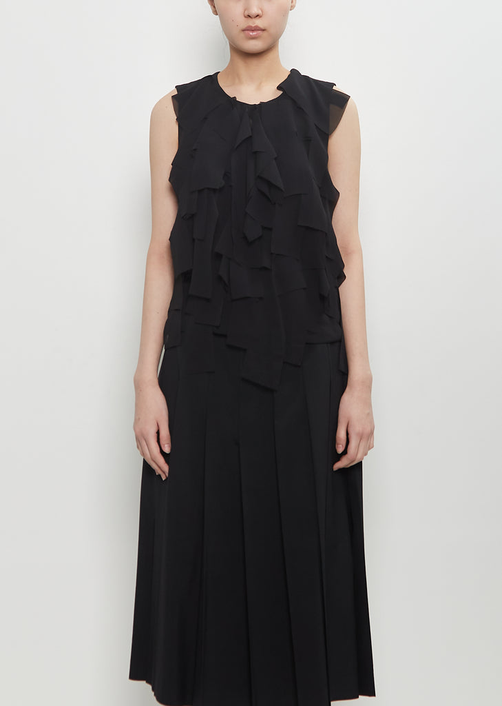 Comme des Garçons Comme des Garçons black sleeveless blouse with a round neckline and ruffle details at front in sheer georgette. Features a tonal concealed hook and zipper closure at back.